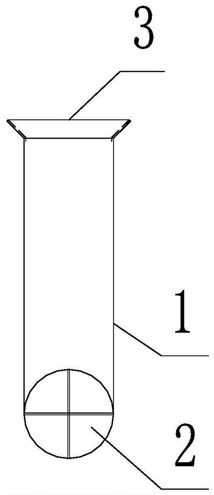 沉淀池套筒閥通過(guò)連接的管道和沉淀池組成連通器,利用靜壓差原理,通過(guò)調(diào)節(jié)套筒閥的出水高度,排泥并調(diào)節(jié)排泥量。套筒閥的本體1上部通常有一個(gè)一字橫梁、底部十字支撐2,一字橫梁的頂部還設(shè)置有傘帽3,如圖1所示。傘帽和十字支撐的存在容易造成絮狀物的纏繞導(dǎo)致堵塞,這樣的結(jié)構(gòu)設(shè)計(jì)容易造成套筒閥出水量減小,使污泥回流量、回流比降低。本實(shí)用新型正是基于此,提出了一種新型沉淀池套筒閥,旨在克服傳統(tǒng)套筒閥的上述缺陷,提高污泥回流量。